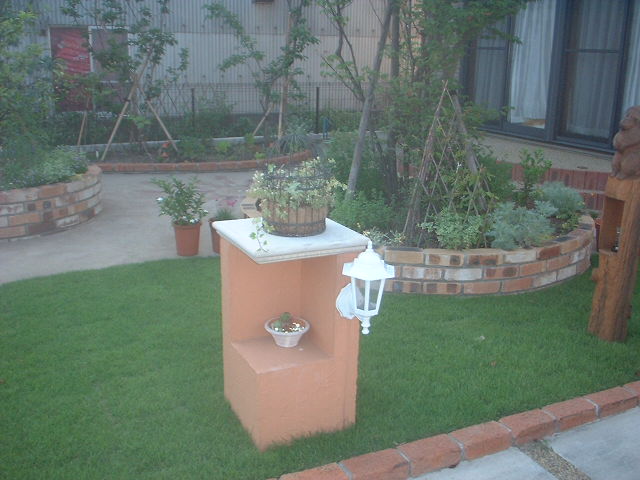 駐車場兼アプローチの脇はアクセントとして日時計や花台を作りました。 手前の筒型は土管を化粧(タカショー:ネットストーンとジュラストーン乱貼り)したもので、日時計を載せました。後方の花台はブロック積みにジョリパット塗りしました。 一番家側の花台は裏側に立水栓を付けました。 |