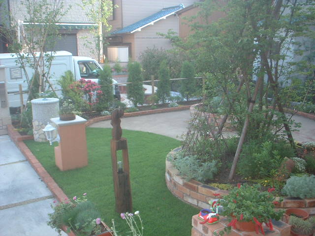 芝はいったん工事を空けて翌年の4月に貼りました。この時期に貼れば芝は痛まず活着が早いのです。最適な植栽時期を選べるというのも分割工事の利点です。 |