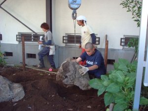 | 翌日砂利を敷き、根締め(景石の裾に添える下草)を植えて完成。 学校の評判も良く、参加した二人も良い思い出になったことでしょう。 お金に替えられない充実感を私達も得ることが出来ました。新しい試みに協力させて頂き大変感謝しています。 |